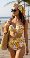 • Golden yellow and white two-piece swim set with a flattering high-waisted fit